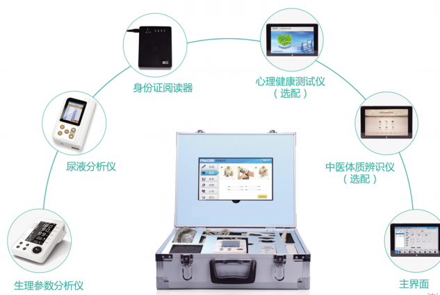 可检测项目包括:体温、血压、血氧、心电、血糖/尿酸/总胆固醇、尿液分析、中医体质辨识系统、心理健康测试系统。